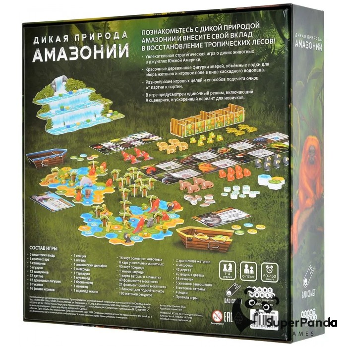 "Дикая природа Амазонии" - это стратегическая настольная игра, в которой вы создаёте собственную экосистему в тропических лесах Амазонии. Заселяйте джунгли животными, высаживайте деревья и растения, продумывая их взаимодействие, чтобы построить гармоничную и процветающую экосистему.